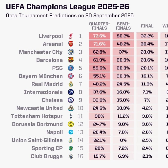 opta最新欧冠夺冠概率:利物浦18%第一,阿森纳17%第二,皇马第七