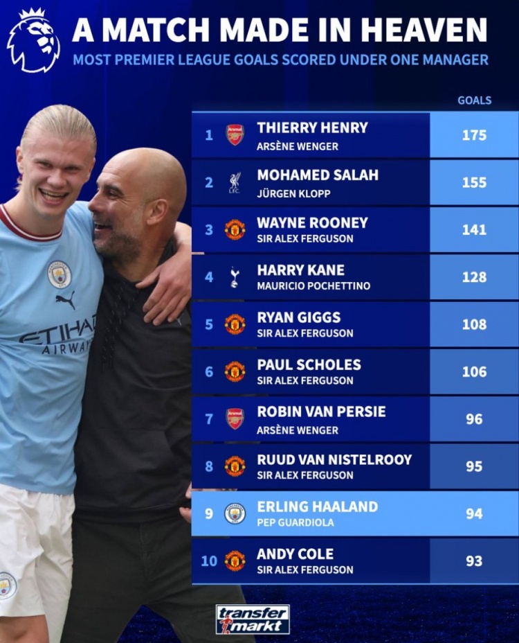 英超并吞主帅治下球员进球榜:亨利175球居首,萨拉赫155球