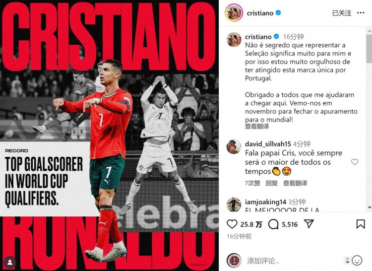 加冕世初赛弓手王!C罗社媒:很自大为葡萄牙兑现独到里程碑