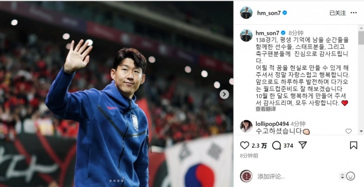 孙兴慜社媒:很自重为韩国出战138场,我会不竭奋发备战寰宇杯