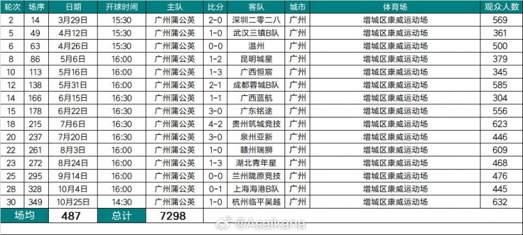 2025中乙联赛广州蒲公英队现场不雅世东说念主数统计:总共7298东说念主次,场均487东说念主。