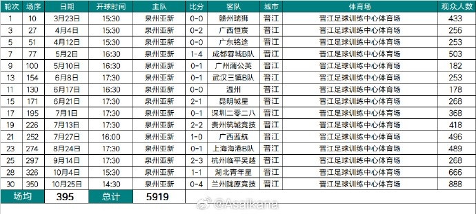 2025中乙联赛泉州亚新队现场不雅世东说念主数统计:总共5919东说念主次,场均395东说念主。