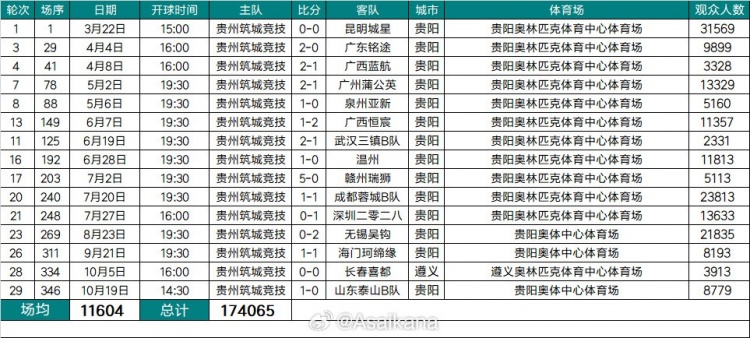 2025中乙联赛贵州筑城竞技队现场不雅世东说念主数统计:总共174065东说念主次,场均11604东说念主。