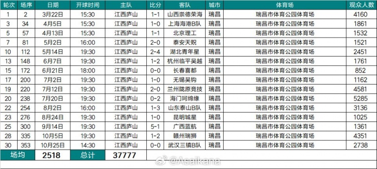 2025中乙联赛江西庐山队现场不雅世东说念主数统计:总共37777东说念主次,场均2518东说念主。