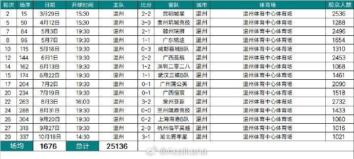 2025中乙联赛温州队现场不雅世东说念主数统计:总共25136东说念主次,场均1676东说念主。