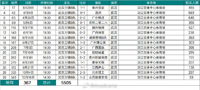 2025中乙联赛武汉三镇B队现场不雅世东说念主数统计:总共5505东说念主次,场均367东说念主。