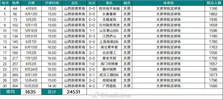 2025中乙联赛山西崇德荣海现场不雅世东说念主数统计:总共24531东说念主次,场均1635东说念主。