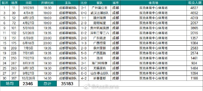 2025中乙联赛成齐蓉城B队现场不雅世东说念主数统计:总共35183东说念主次,场均2346东说念主。