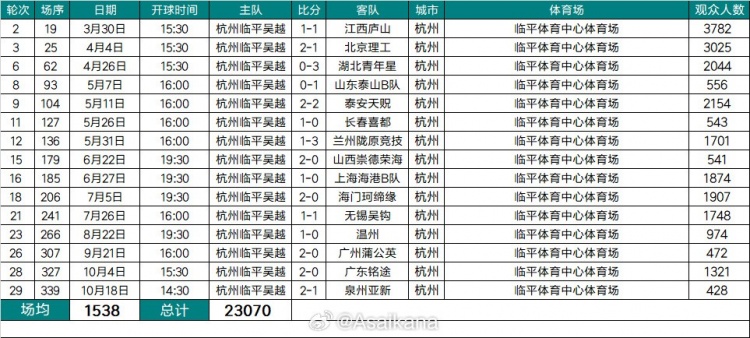 2025中乙联赛杭州临平吴越队现场不雅世东说念主数统计:总共23070东说念主次,场均1538东说念主。