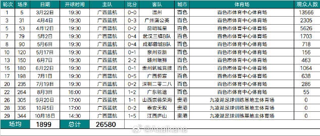2025中乙联赛广西蓝航队现场不雅世东说念主数统计:总共26580东说念主次,场均1899东说念主。