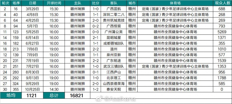 2025中乙联赛赣州瑞狮队现场不雅世东说念主数统计:总共16821东说念主次,场均1121东说念主。