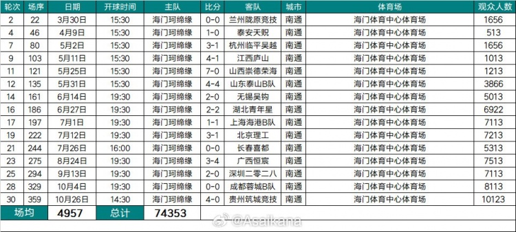 2025中乙联赛海门珂缔缘队现场不雅世东说念主数统计:总共74353东说念主次,场均4957东说念主。