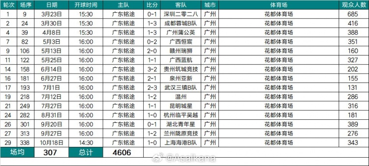 2025中乙联赛广东铭途队现场不雅世东说念主数统计:总共4606东说念主次,场均307东说念主。