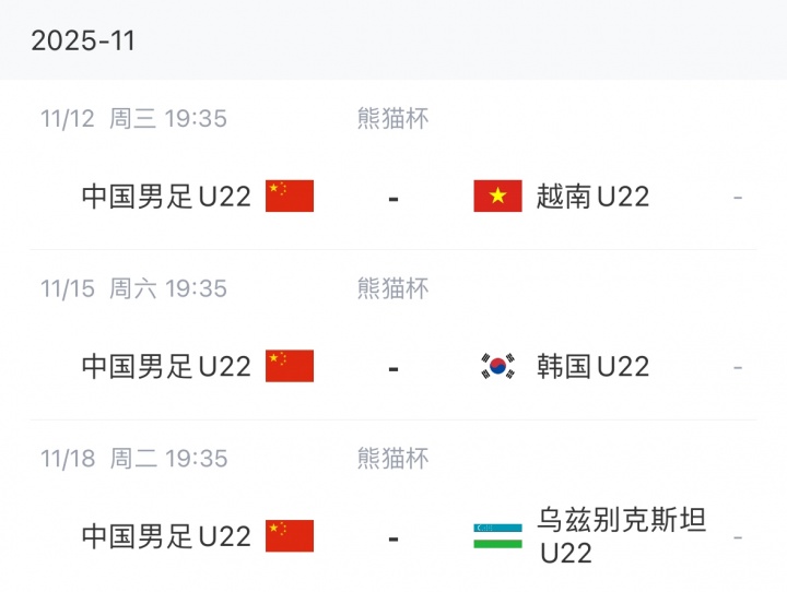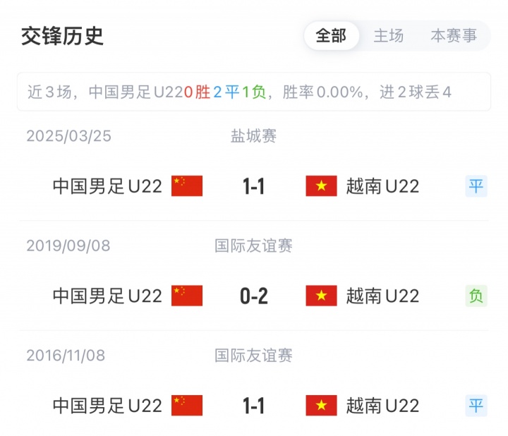 两边近3次交锋,国足U22对阵越南2平1负未能取胜。本次熊猫杯国足U22将分离与越南U22、韩国U22、乌兹别克斯坦U22进行较量。