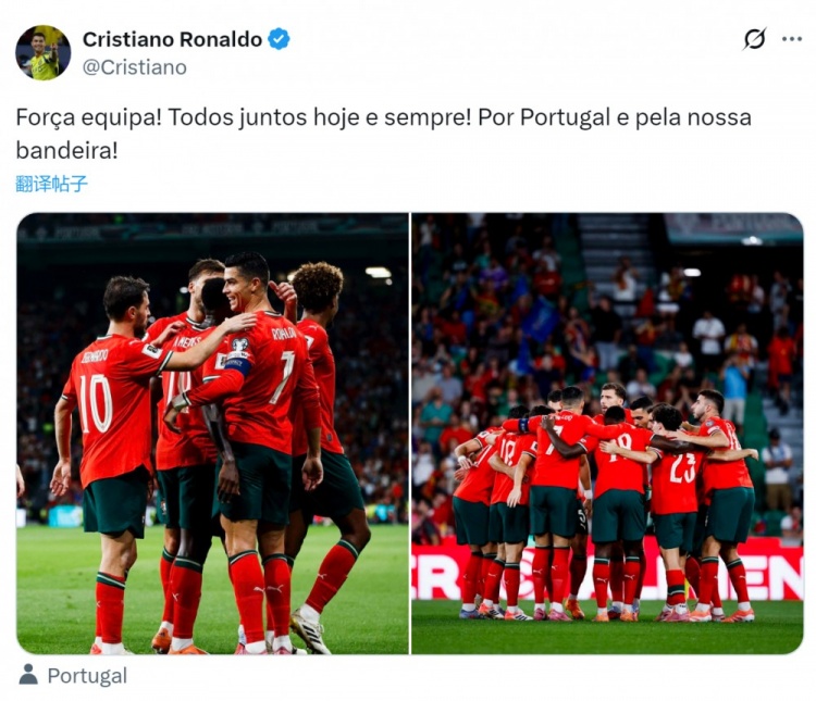 停赛缺席,C罗社媒为队友加油:咱们互助一心,为葡萄牙而战!