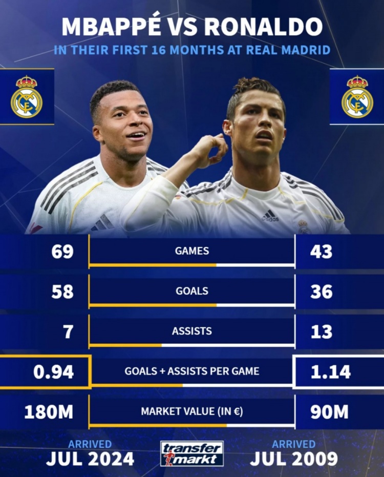 10月8日讯 姆巴佩已为皇马遵循16个月,德国转会市集统计了他与C罗在皇马同时的数据。