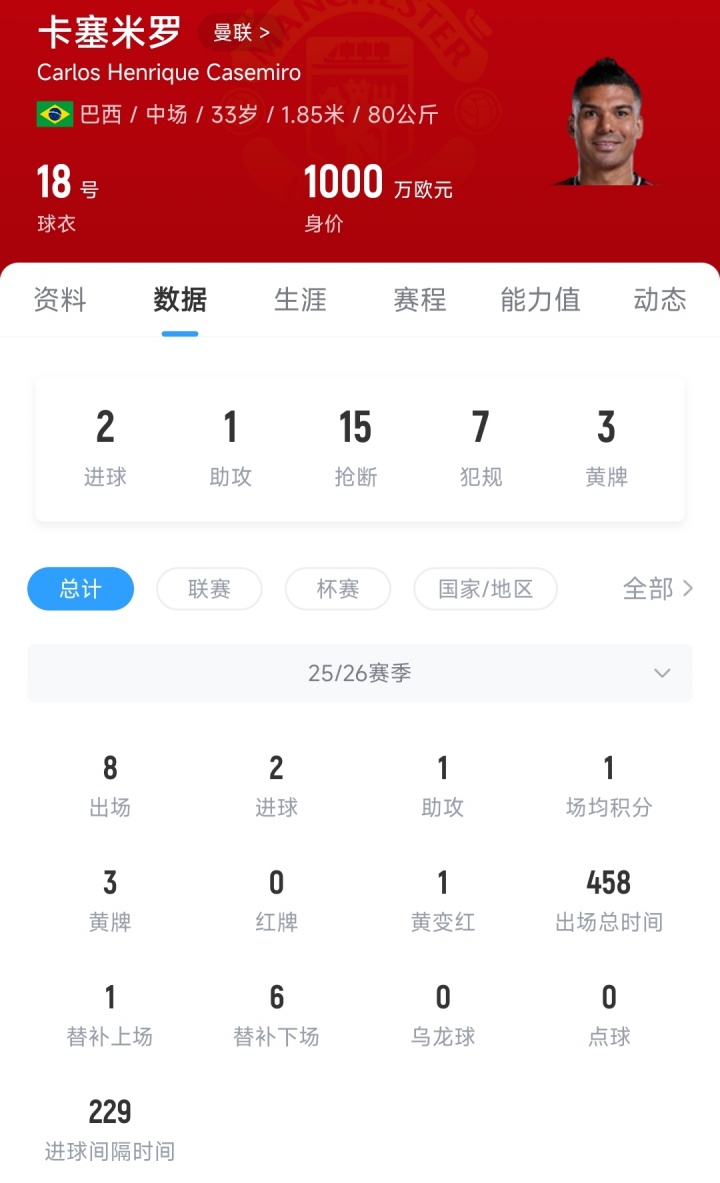 本赛季卡塞米罗算作曼联的主力后腰,出战8场比赛共458分钟,孝敬2粒进球和1次助攻。卡塞米罗在场的期间内,曼联仅丢掉3球,而卡塞米罗不在场的期间内,曼联丢掉了13球。