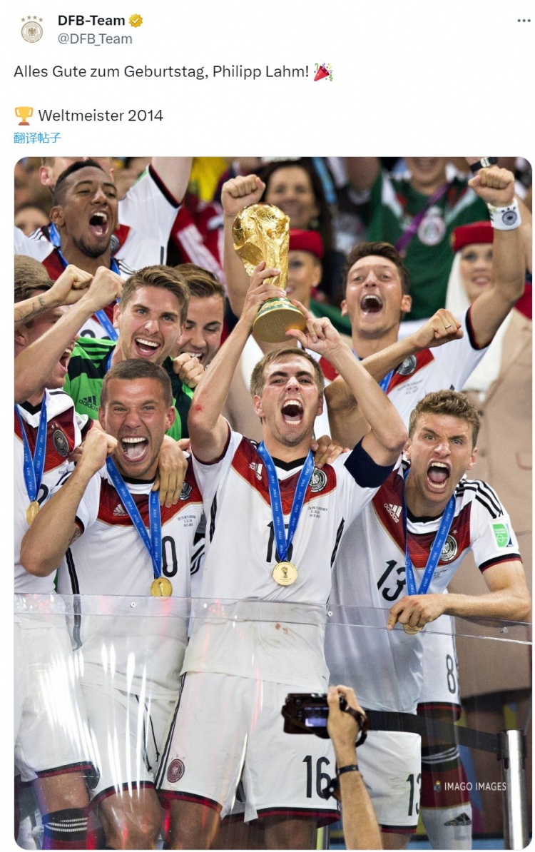 德国队社媒晒出拉姆捧起恣意神杯的相片,配文:“祝2014年宇宙杯冠军拉姆诞辰昂扬!”