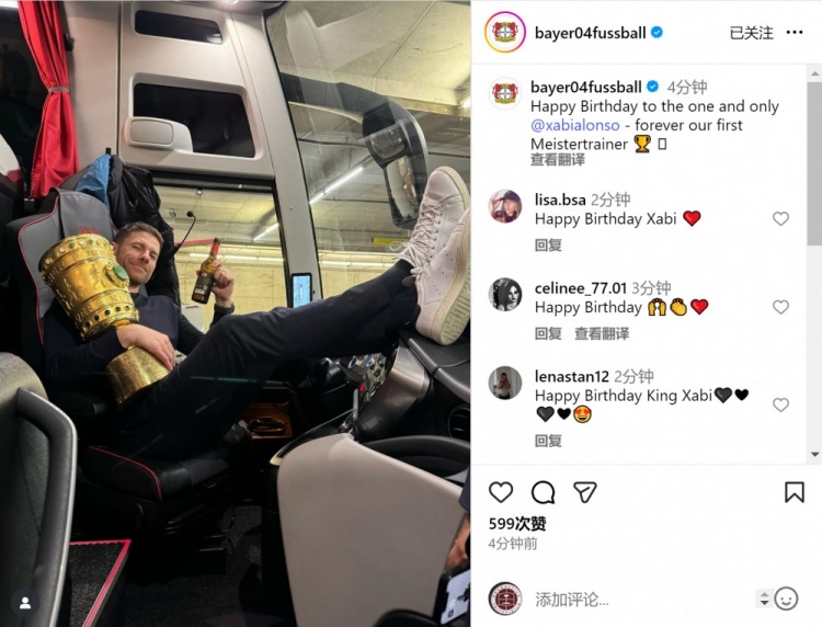 勒沃库森社媒晒出阿隆索握教球队时辰与奖杯的合照,配文:“祝唯一无二的阿隆索诞辰景观,永远是咱们的首位冠军西席。”