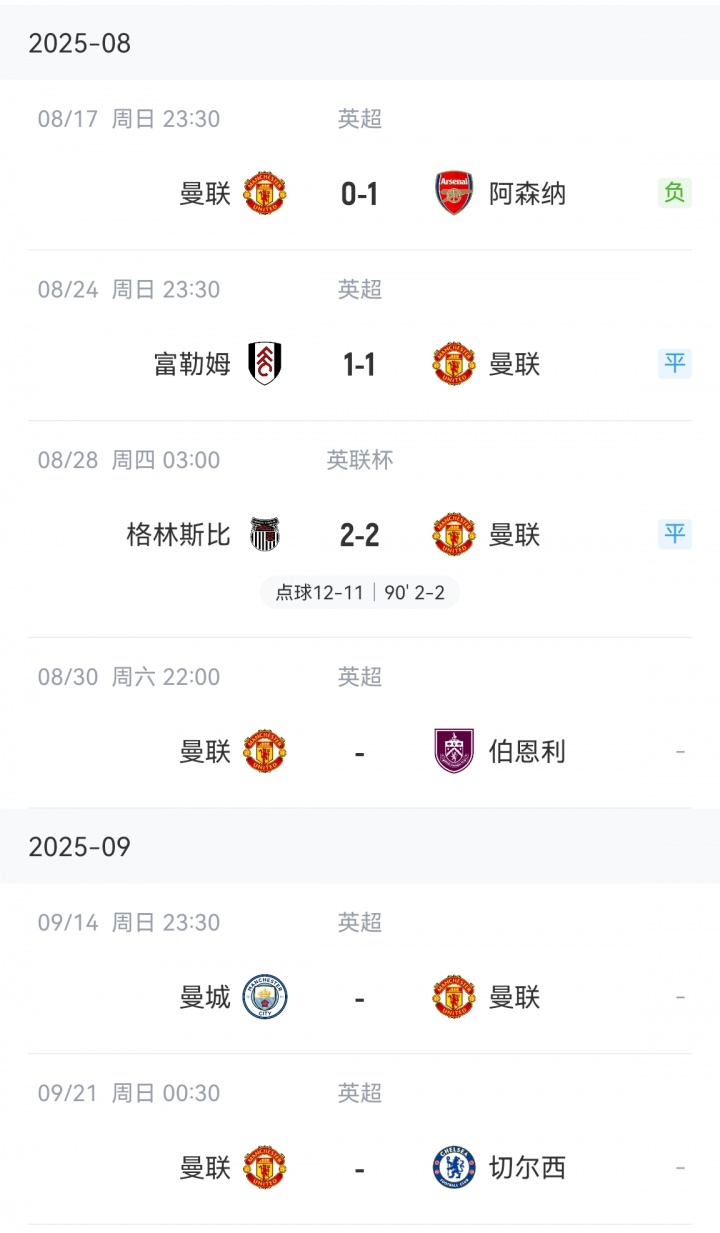 本赛季开赛以来,曼联0-1阿森纳、1-1富勒姆,加上今天的输球,1平2负未曾胜绩。