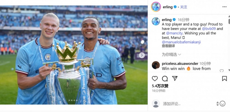 哈兰德告别阿坎吉:顶级好昆季!霸道曾在多特和曼城与你并肩战役