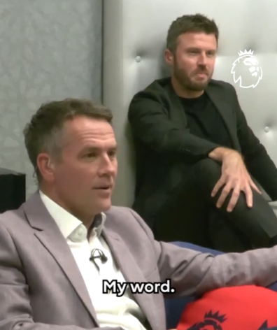 10月20日讯 本轮英超曼联客场2-1打败利物浦,笑傲双红会,赛后英超官方发布了一段欧文和卡里克不雅看比赛直播时的反映。