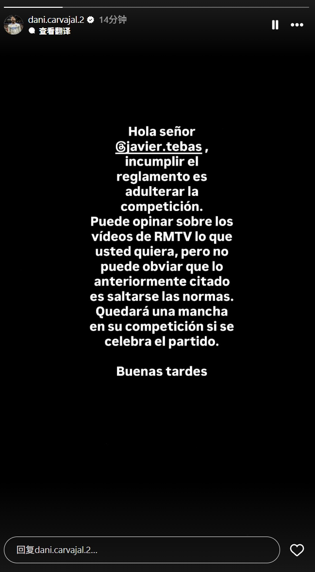 卡瓦哈尔在IG上发布景况,复兴早些本事特巴斯的言论。