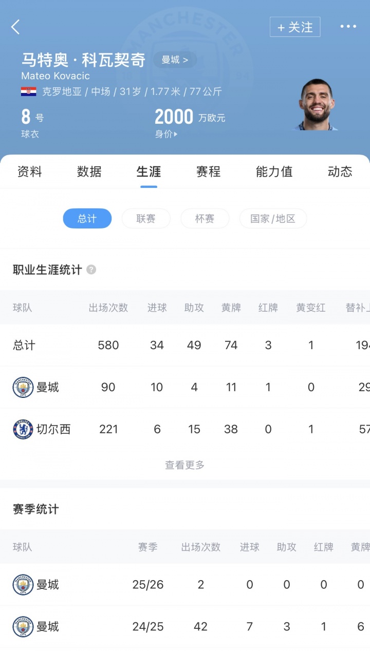 科瓦契奇今夏摄取跟腱手术后,本赛季尚未为曼城首发过。他在九月对阵伯恩利时伤愈插足比赛名单,但仅在对阵埃弗顿和比利亚雷亚尔时替补出场。
