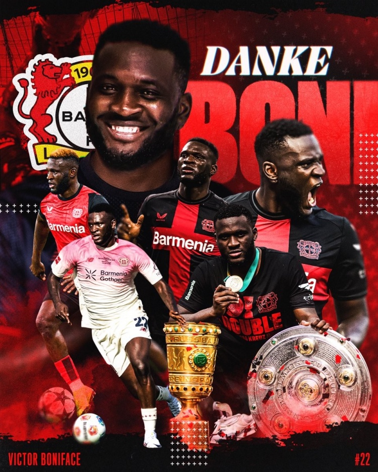 勒沃库森官推文牍:“博尼法斯外租不莱梅一个赛季。祝一切告成,很快再会!”