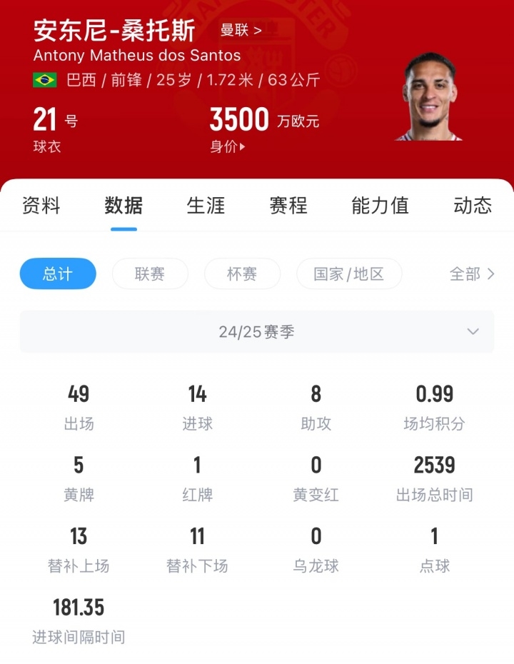 25岁的安东尼2022年8月加盟曼联,总价9500万欧。效用曼联于今,他各项赛事代表球队出战96场得益12球5助。