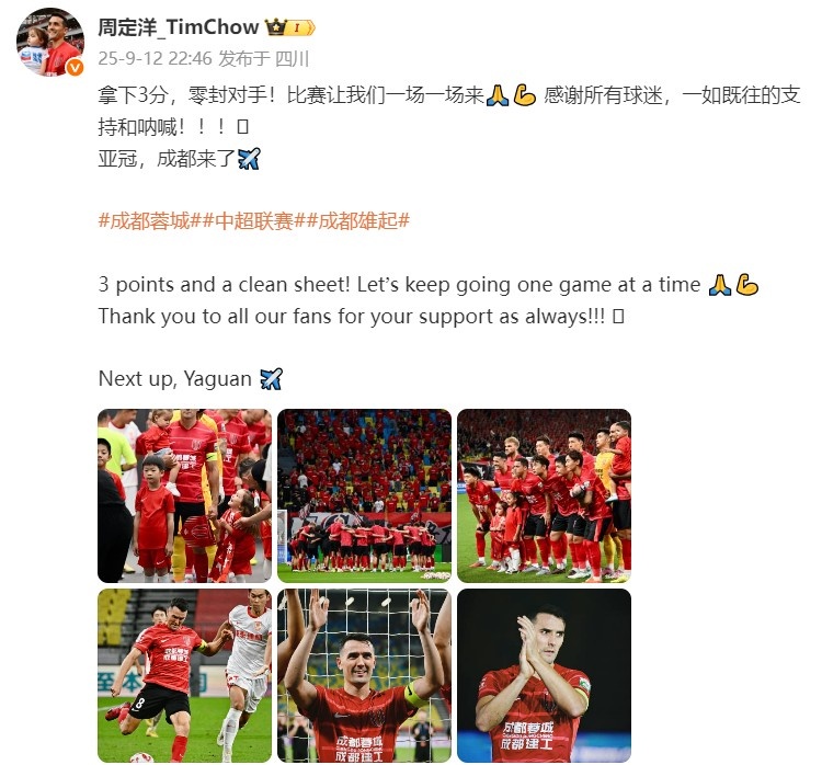 9月12日讯 中超联赛第24轮,成王人蓉城主场1-0打败长春亚泰。赛后,蓉城球员周定洋发文庆祝成功。