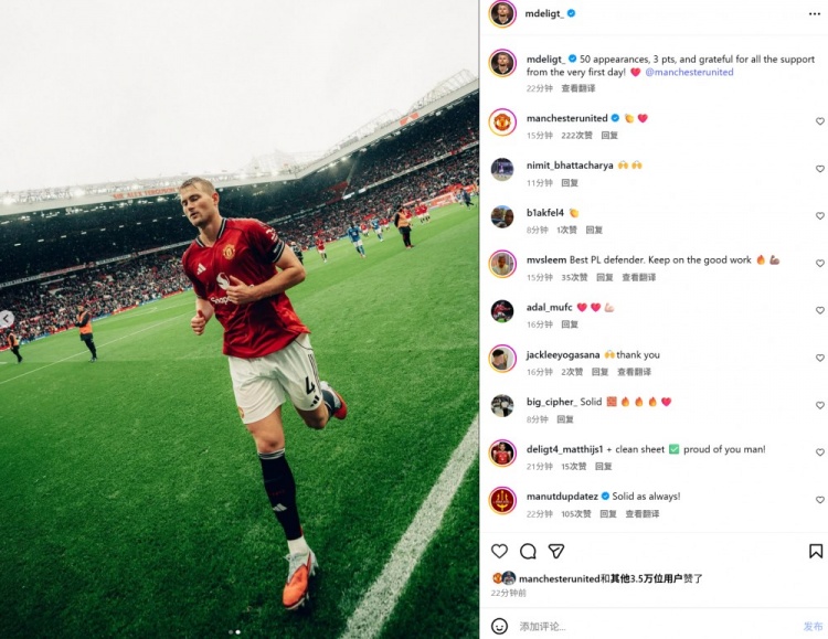本场比赛德里赫特首发出场迎来曼联生计50场里程碑,赛后他也在社媒晒照写说念:“50次出场,拿下三分,感谢从始至终齐因循咱们的球迷们!”