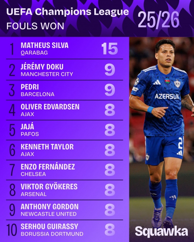 10月23日讯 本赛季欧冠联赛阶段已战罢3轮,Squawka统计了到现在规模的被犯规榜单,卡拉巴赫后卫马修斯-席尔瓦15依次一,曼城边锋多库和巴萨中场佩德里均9次,分列二三位。