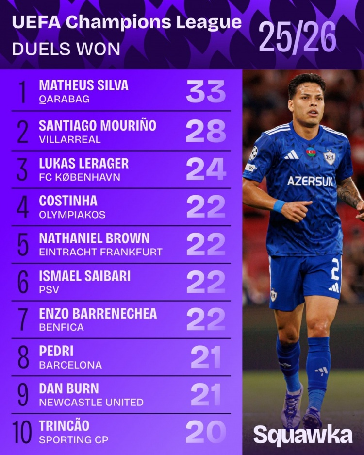 本赛季欧冠得回扞拒榜:马修斯-席尔瓦33纪律一,佩德里21纪律八