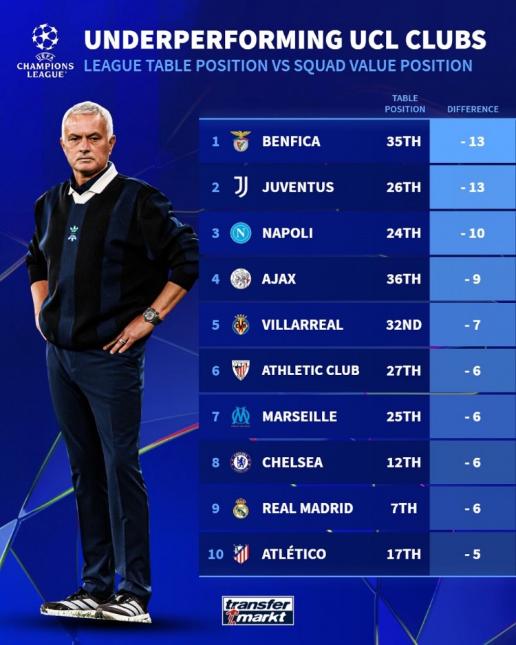 11月6日讯 德国转会市集凭证球队现在欧冠名次与阵立足价名次的差距,列出了本赛季欧冠施展欠安球队榜,本菲卡、尤文最差。