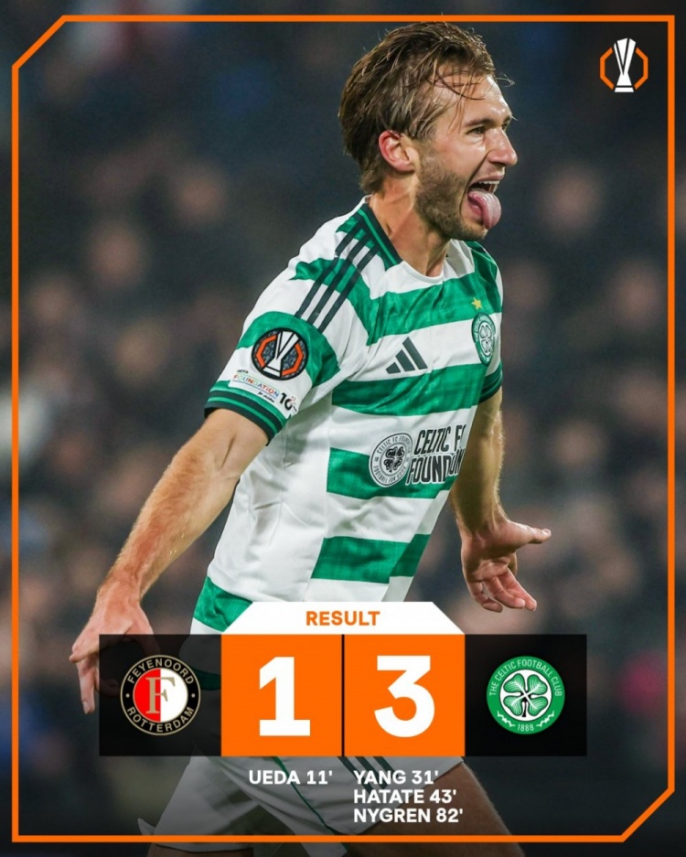 11月28日讯 欧联杯联赛阶段第5轮献技“日本德比”,最终凯尔特东说念主客场3-1打败费耶诺德。