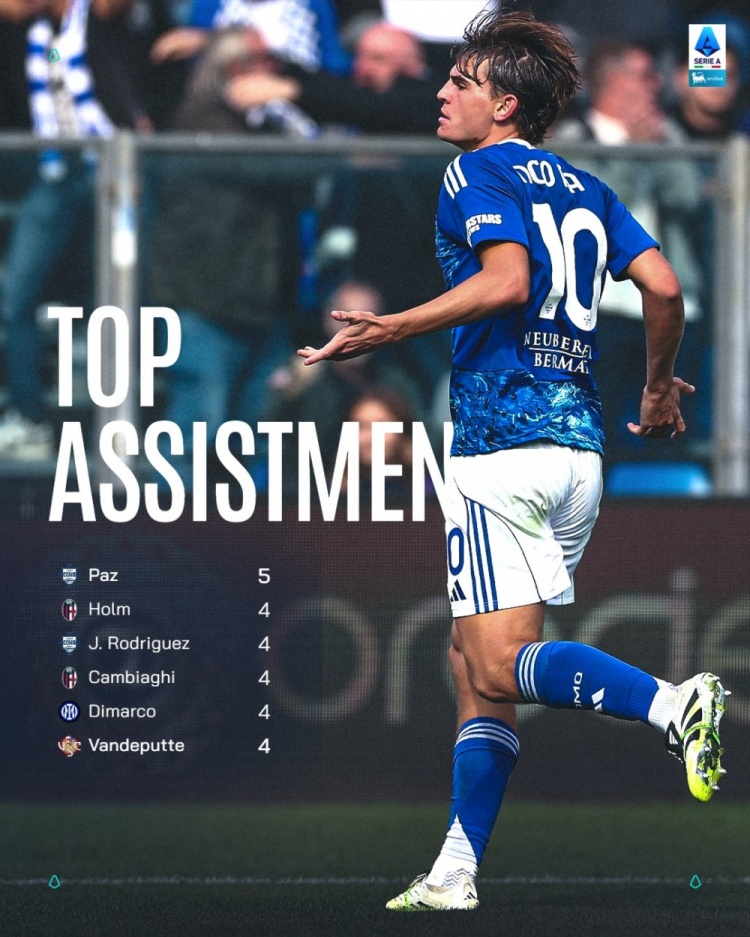 尼科·帕斯本赛季意甲打进5球,比肩排行意甲弓手榜首位,助攻5次,登顶意甲助攻榜,意甲官方社媒晒出弓手榜、助攻榜海报,对他示意祈福。
