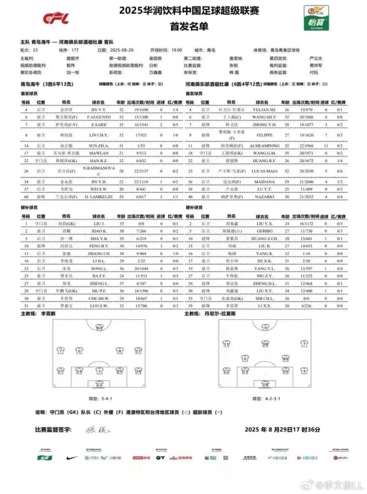 08月29日讯 中超第23轮,青岛海牛vs河南。赛前首发威望已公布。