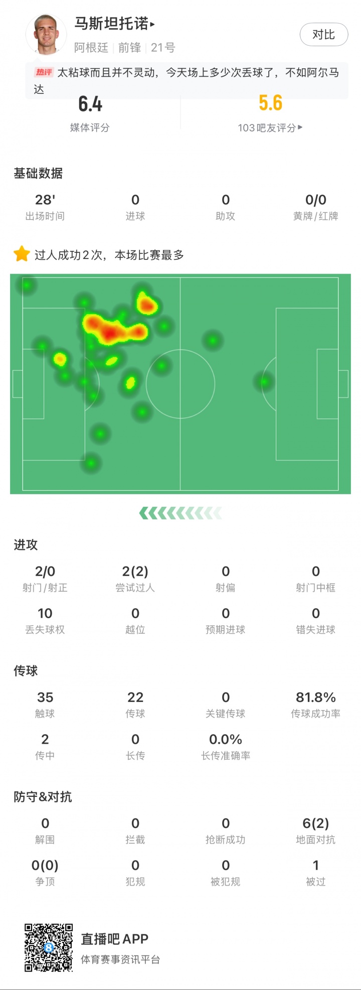 阿根廷10号太千里重!马斯坦托诺仅获6.4分,2射0正2过东谈主10次丢球权