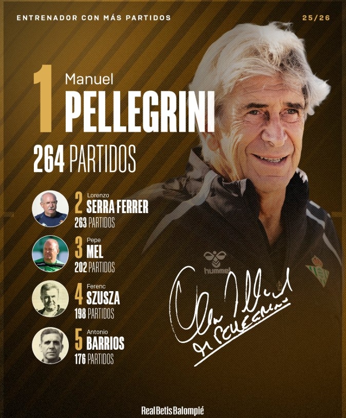 佩莱格里尼迎来我方握教贝蒂斯的第264场比赛,这让他很是洛伦佐-塞拉-费雷尔成贝蒂斯队史握教场次最多的主教养。