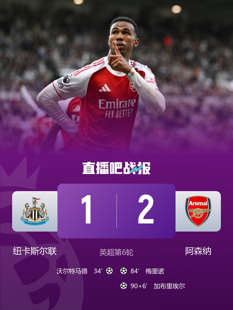 梅里诺头球扳平比分,补时阶段加布里埃尔绝杀!最终,阿森纳2-1逆转纽卡,距离榜首2分。
