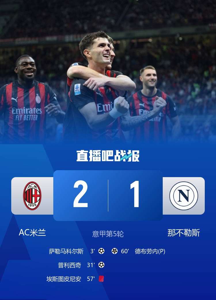 普利西奇传射,埃斯图皮尼安吃到红点套餐,德布劳内点射扳回一球!最终,AC米兰2-1打败那不勒斯,登顶意甲积分榜!