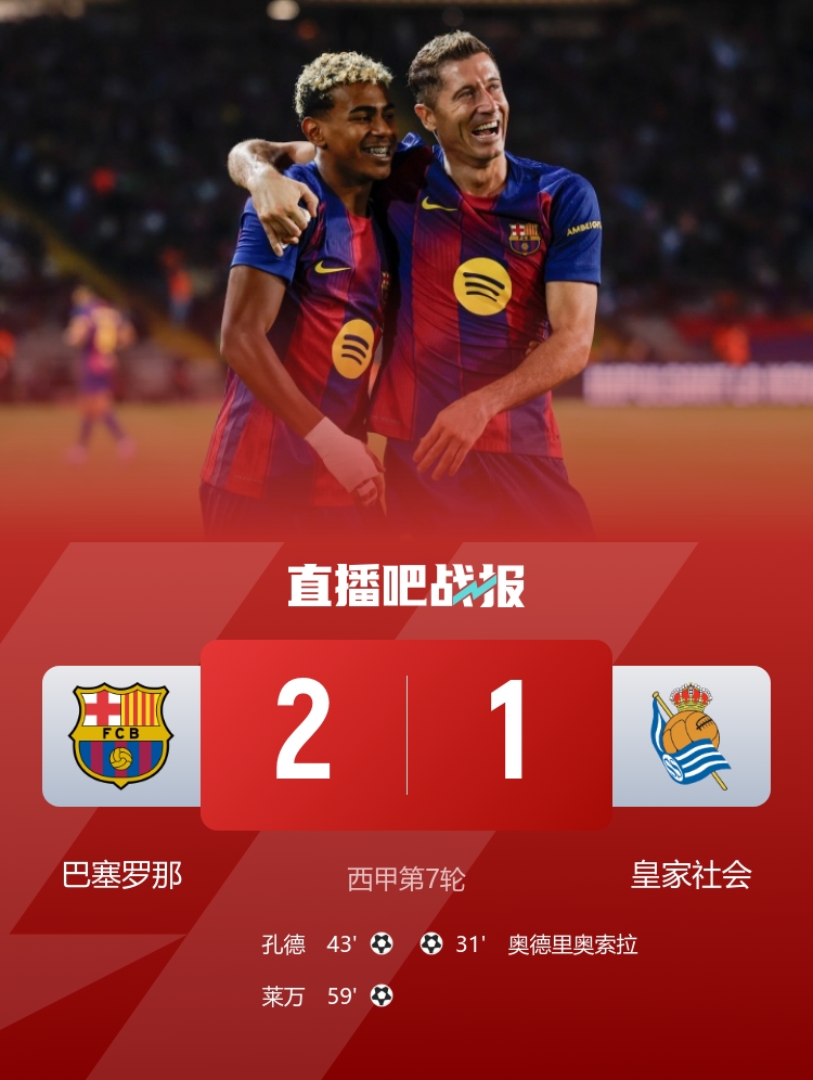 孔德扳平,亚马尔助攻莱万破门,最终巴萨2-1逆转皇家社会,1分上风领跑积分榜。