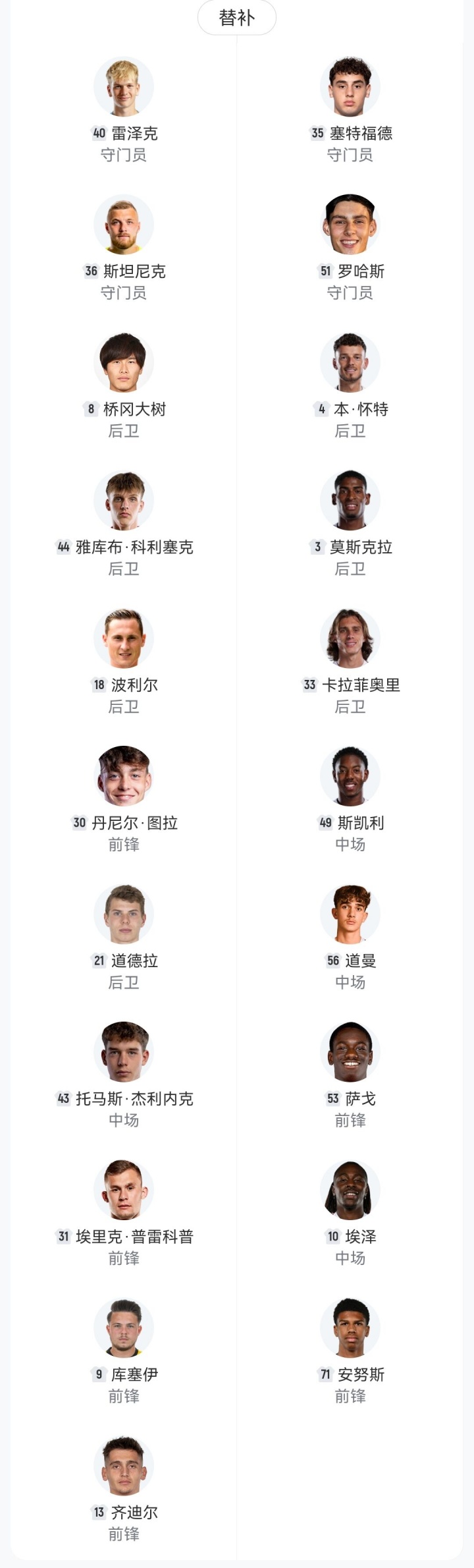 阿森纳现在正遭受伤病潮,一线队锋线6东说念主仅剩特罗萨德、萨卡两东说念主健康,今晚一说念首发;中场梅里诺再度客串中锋,队长厄德高也因伤缺阵;但好音讯是防地“八大金刚”现在均健康无虞,为枪手保证了防地的深度。