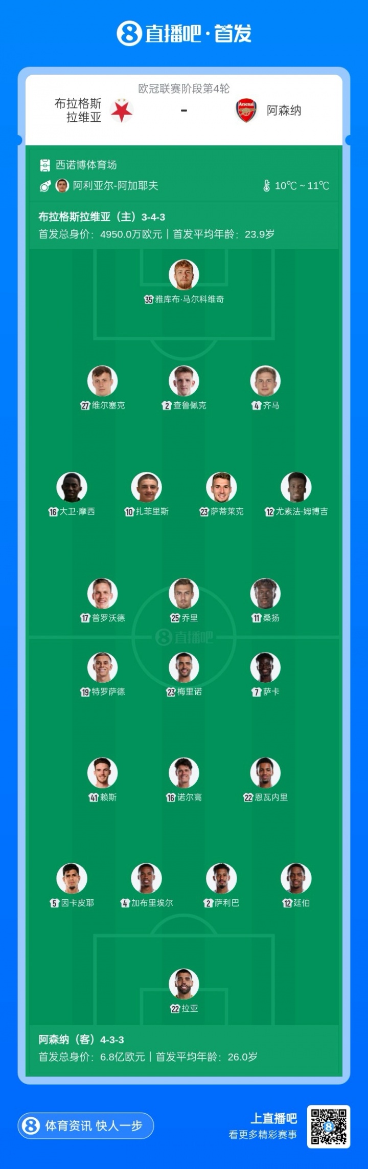 11月05日讯 欧冠第4轮,阿森纳将客战布拉格斯拉维亚,赛前枪手依然公布了本场比赛的首发名单。