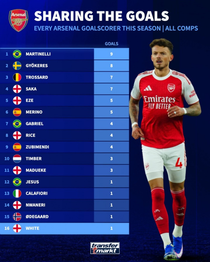 多点着花! 阿森纳本赛季16东说念主赢得进球, 马丁内利打进9球最多