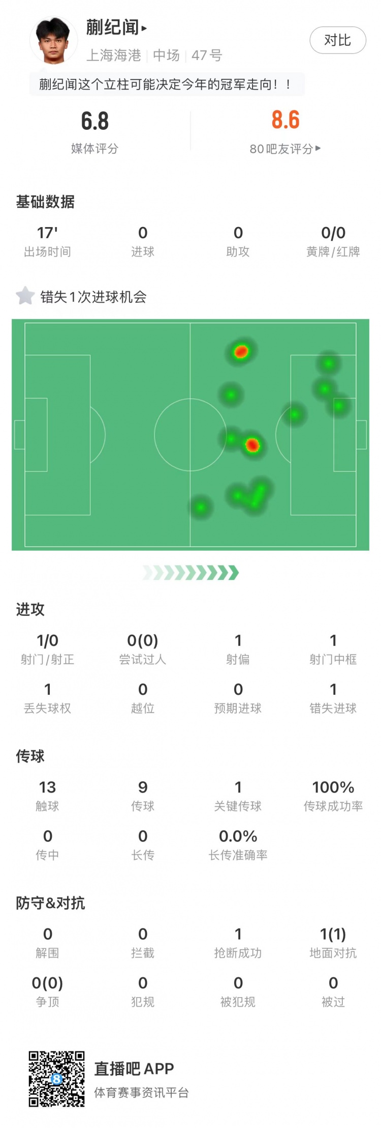 本场蒯纪闻鄙人半时替补外助梅伦多登场,出场后他显得很是活跃。在这17分钟里,蒯纪闻的传球得胜率达到了100%,比赛临了本事,他用活泼的跑位创造了一次良机,但他的射门击中了球门立柱,错失了绝杀。