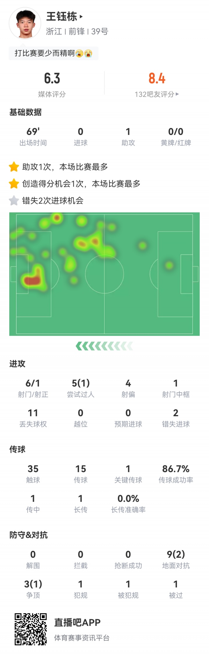 08月24日讯 中超第22轮,浙江客场2-2梅州。本场比赛,王钰栋首发出场,随后在第69分钟被换下。