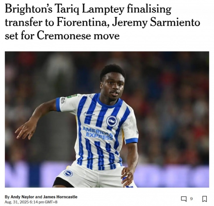 8月31日讯 TA报说念,布莱顿两名球员兰普泰以及萨米恩托将转会意甲,分离去往佛罗伦萨以及克雷莫内塞。