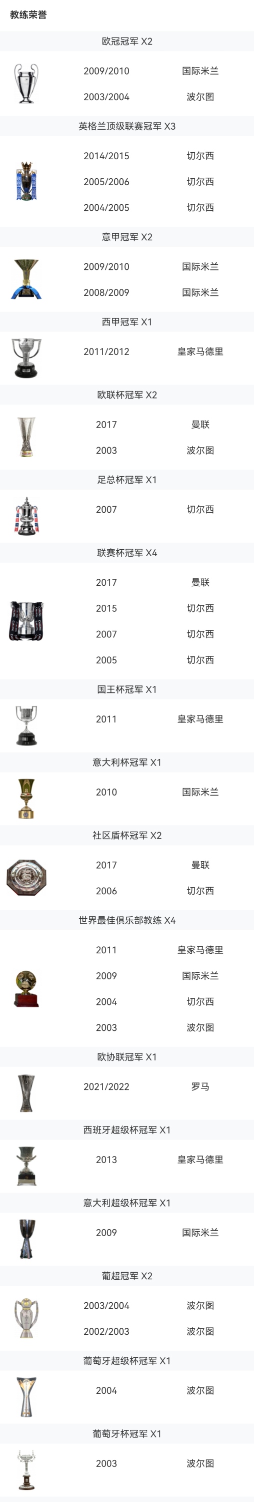 62岁的穆里尼奥最近一次率队夺冠一经21/22赛季在罗马拿到的欧协联冠军。再往前回想,便是曼联时代16/17赛季拿到的“小三冠”。